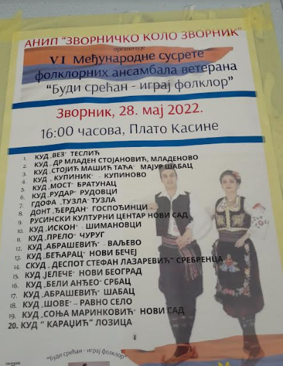 Na platou ispred Kasine publici će se od 16 časova predstaviti dvadeset kulturno umetničkih društava iz više gradova Srbije, BiH i RS. Biće to prava smotra različitih narodnih nošnji,muzike, igre, pesme i tradicije.