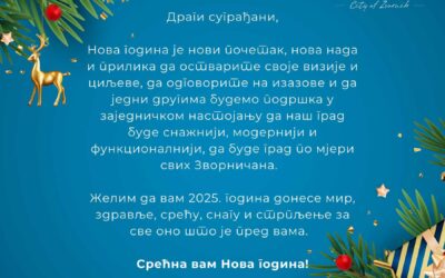 „Dragi sugrađani, Nova godina je novi početak, nova nada i prilika da ostvarite svoje vizije i ciljeve, da odgovorite na izazove i da jedni drugima budemo podrška u zajedničkom nastojanju da naš grad bude snažniji, moderniji i funkcionalniji, da bude grad po mjeri svih Zvorničana. Želim da vam 2025. godina donese mir, zdravlje, sreću, snagu i strpljenje za sve ono što je pred vama. Srećna vam Nova godina!“