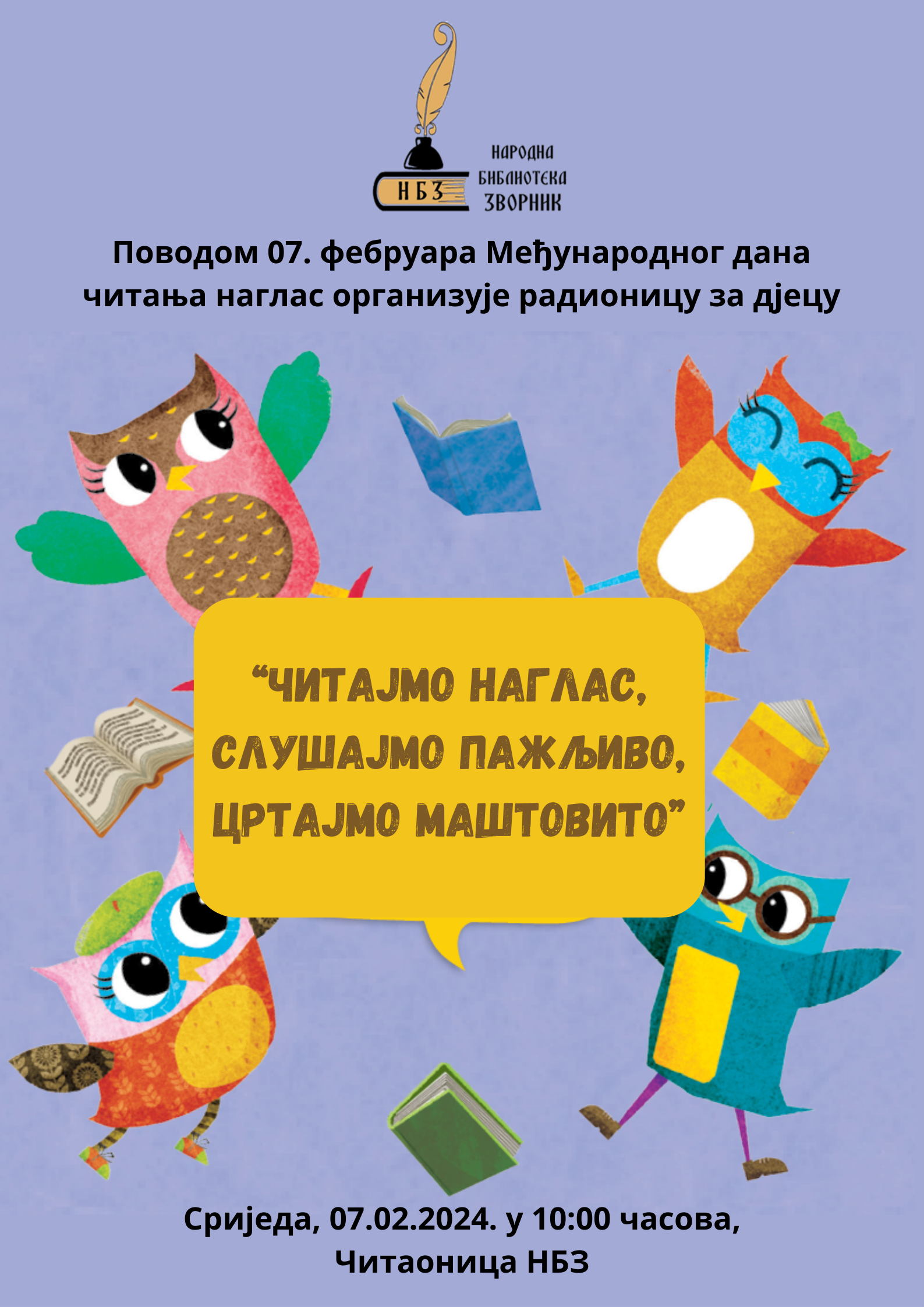 Narodna biblioteka Zvornik povodom 07. februara organizuje radionicu "Čitajmo naglas, slušajmo pažljivo, crtajmo maštovito".