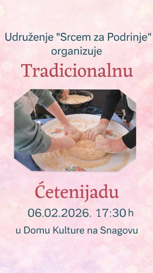 Udruženje”Srcem za Podrinje” iz Zvornika,poziva na tradicionalnu ćetenijadu, događaj koji čuva tradiciju, običaje i kulturu.Ćetenijada će biti organizovana u Domu kulture u Snagovu u petak,6.februara sa početkom u 17:30 časova.