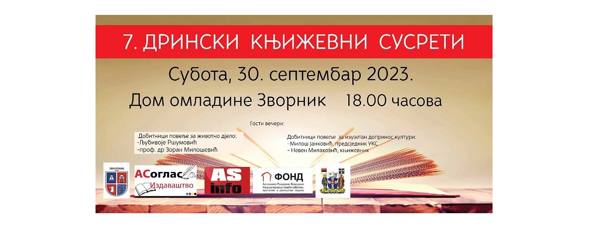 Drinski književni susreti, sedmi po redu, biće održani u subotu 30.septembra u Domu omladine u Zvorniku.