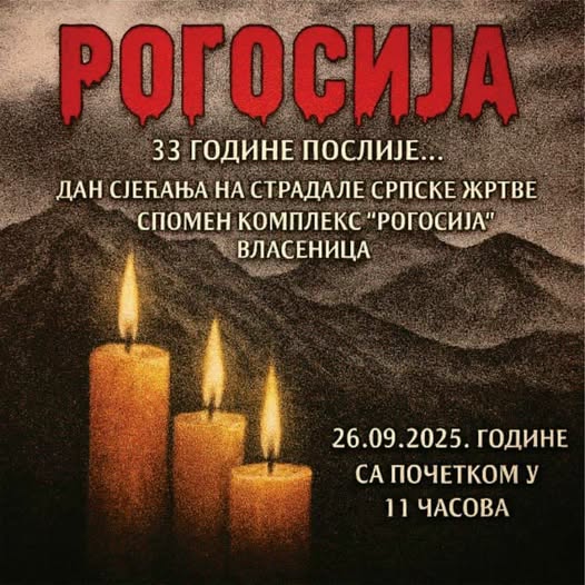 Kod Spomen-obilježja na uzvišenju Rogosija kod Vlasenice, u petak, 26. septembra, sa početkom u 11.00 časova, biće obilježene 33 godine od pogibije 29 boraca Vojske Republike Srpske koje su svirepo ubili muslimanski vojnici.