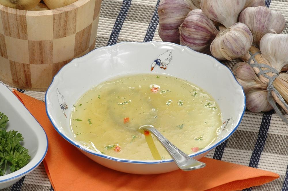 Sastojci: 20 čena belog luka,2 glavice crnog luka,1 šargarepa,1 velika kašika maslaca,1 velika kašika maslinovog ulja,2,5 dl pilećeg bujona,2 dl kisele pavlake,1 mala kašika majčine dušice,3 parčeta starog hleba,so, biber,1 šaka peršuna.