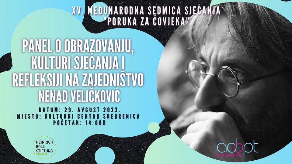 U prostorijama Kulturnog centra u Srebrenici, očekuje se interesantan panel s još interesantnijim gostima "Panel o obrazovanju, kulturi sjećanja i refleksiji na zajedništvo" s Nenadom Veličkovićem. Kroz diskusiju tematiziraće se obrazovani procesi, kakvi oni jesu i kako ih je moguće unaprijediti, sa osvrtom koliku ulogu obrazovanje ima u kulturi sjećanja, te koje su ključne tačke spajanja u vremenu u kojem jesmo