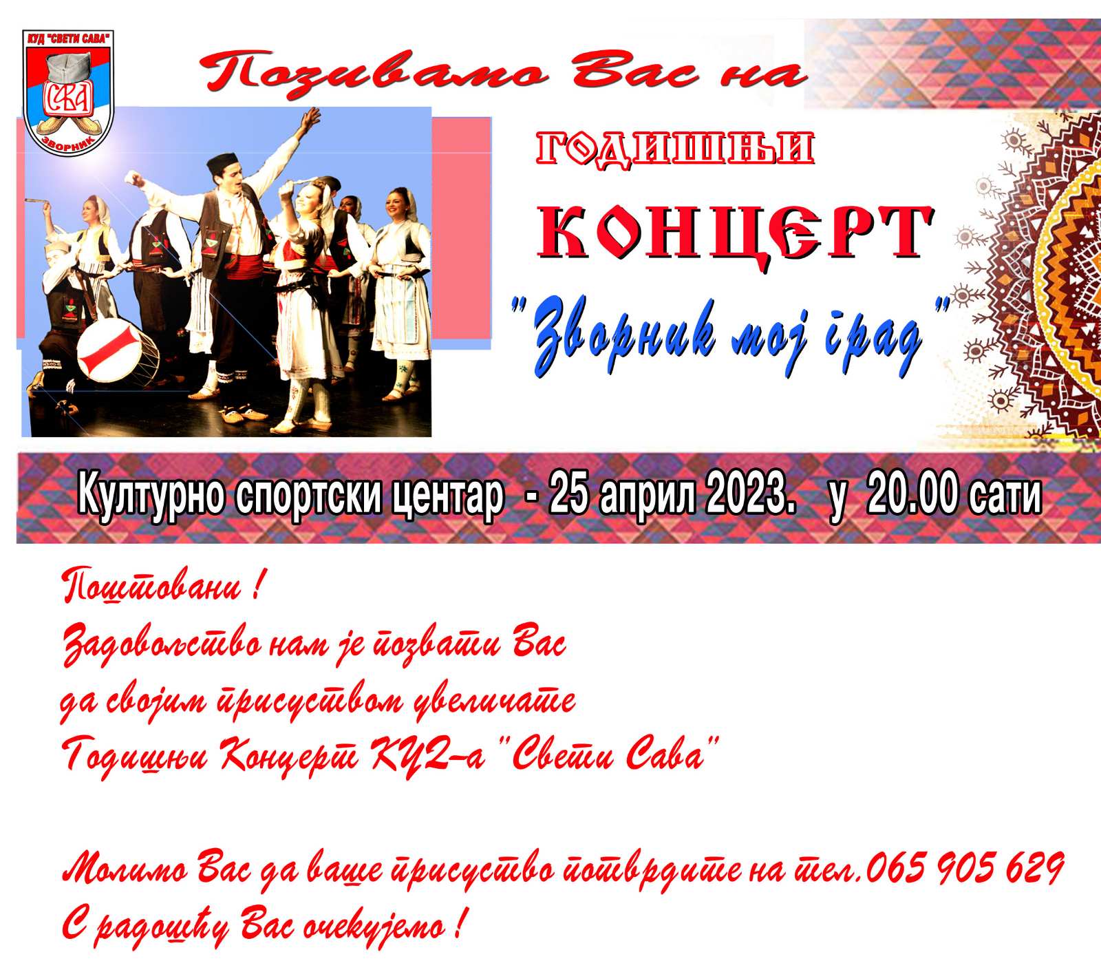 U zvorničkom Rekreativno sportskom centru u utorak, 25.aprila sa početkom u 20 časova biće održan godišnji koncert Kulturno-umjetničkog društva „Sveti Sava“ iz Zvornika.