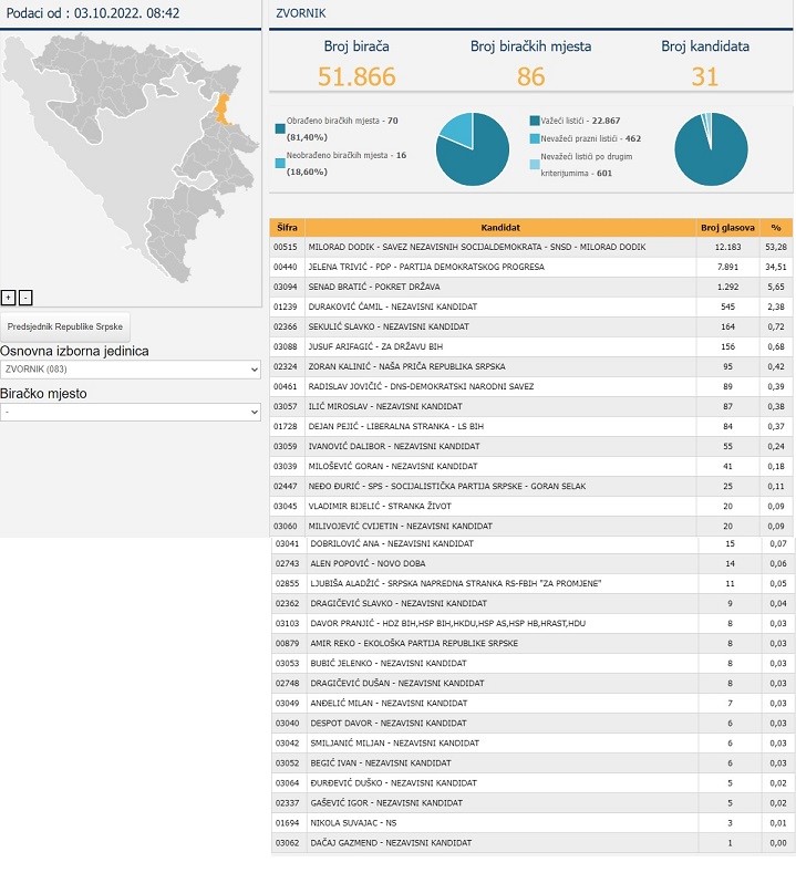 Na sajtu CIK-a, shodno procentu obrađenih informacija objavljuju se rezultati jučerašnjeg izbornog dana sa Opštih izbora. Ovo su ubačeni podaci kako je glasao Zvornik kada su izbori za člana Predsedništva BIH i Predsednika RS u pitanju.