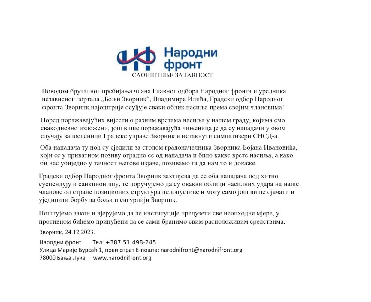 „Povodom brutalnog prebijanja člana Glavnog odbora Narodnog fronta i urednika  nezavisnog portala „Bolji Zvornik“, Vladimira Ilića, Gradski odbor Narodnog fronta Zvornik najoštrije osuđuje svaki oblik nasilja prema svojim članovima! Pored poražavajućih vijesti o raznim vrstama nasilja u našem gradu, kojima smo svakodnevno izloženi, još više poražavajuća činjenica je da su napadači u ovom slučaju zaposlenici Gradske uprave Zvornik i istaknuti simpatizeri SNSD-a. Oba napadača tu noć su sjedili za stolom gradonačelnika Zvornika Bojana Ivanovića, koji se u privatnom pozivu ogradio se od napadača i bilo kakve vrste nasilja, a kako bi nas ubijedio u tačnost njegove izjave, pozivamo ga da nam to i dokaže. Gradski odbor Narodnog fronta Zvornik zahtijeva da se oba napadača pod hitno suspenduju i sankcionišu, te poručujemo da su ovakvi oblici nasilnih udara na naše članove od strane pozicionih struktura nedopustive i mogu samo još više ojačati i ujediniti borbu za bolji i sigurniji Zvornik. Poštujemo zakon i vjerujemo da će institucije preduzeti sve neophodne mjere, u protivnom bićemo prinuđeni da se sami branimo svim raspoloživim sredstvima”, stoji na kraju saopštenja  Glavnog odbora Narodnog fronta.