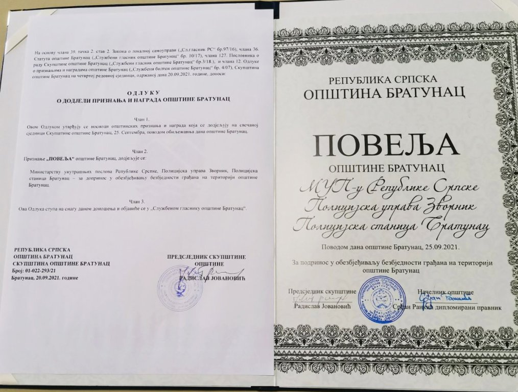 Policijskoj stanici Bratunac dodijeljeno je priznanje „Povelja“ opštine Bratunac za doprinos u obezbjeđivanju bezbjednosti građana na teritoriji ove opštine. Povelja je dodeljena povodom Dana opštine Bratunac.