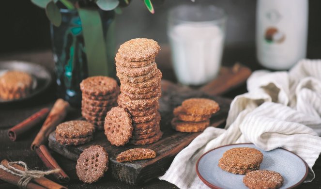 U činiji pomešati kokosovo ulje, med, bademovo mleko i mleveni lan. U blender staviti ovsene pahuljice, dobro izmiksati, pa prebaciti u veću posudu. Dodati bademovo i heljdino brašno, cimet, sodu bikarbonu, so i muskatni orah, ubaciti smesu od bademovog mleka, sve dobro sjediniti, pa prebaciti na radnu površinu i istanjiti oklagijom. Modlom ili čašom vaditi krugove, ređati na pleh obložen papirom za pečenje, izbockati viljuškom, te peći u rerni na 170 stepeni oko 10 minuta.