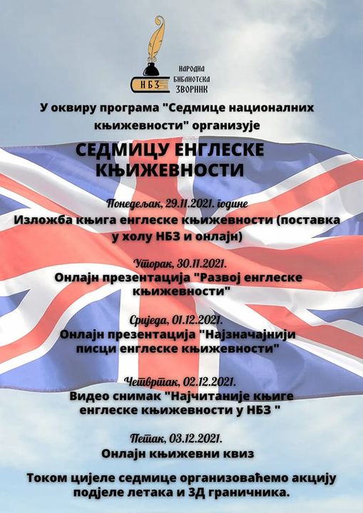 U okviru programa „Sedmice nacionalnih književnosti“ Narodna biblioteka Zvornik ovu sedmicu posvećuje engleskoj književnosti. Danas je otvorena izložba knjiga engleske književnosti, koju možete pogledati i online.Sutra je predviđena online prezentacija pod nazivom”Razvoj engleske književnosti,a u sredu prezentacija “Najznačajniji pisci engleske književnosti”.U četvrtak će pratioci Narodne biblioteke Zvornik moći pogledati video snimak”Najčitanije knjige engleske književnosti u Narodnoj biblioteci Zvornik” a u petak učestvovati u online književnom kvizu. Tokom cele sedmice biće organizovane akcije podele letaka i 3D graničnika.